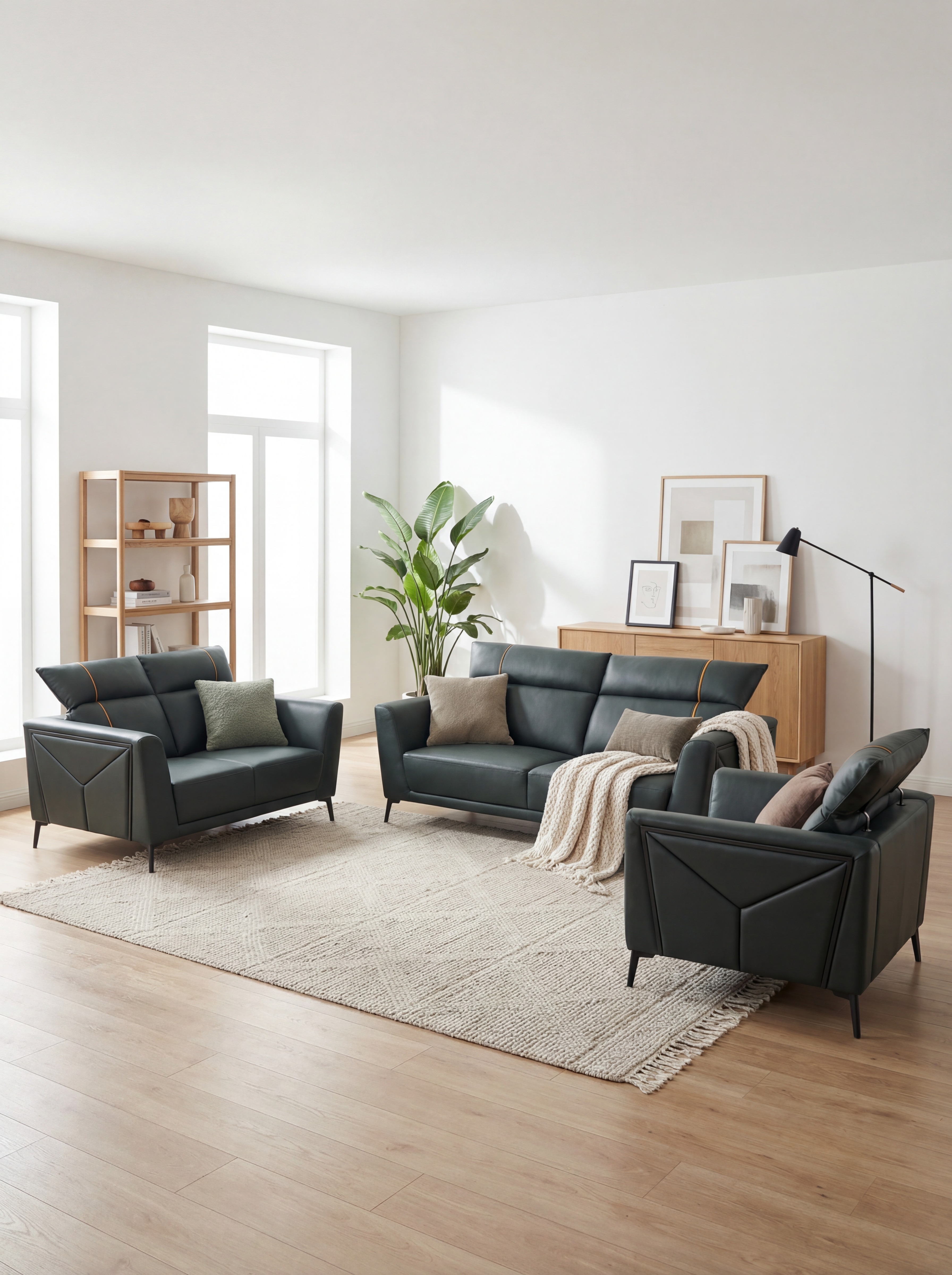 1+2+3 皮沙發配置,搭配機能頭墊與亮眼車縫線,讓全家人共享溫暖放鬆時光。