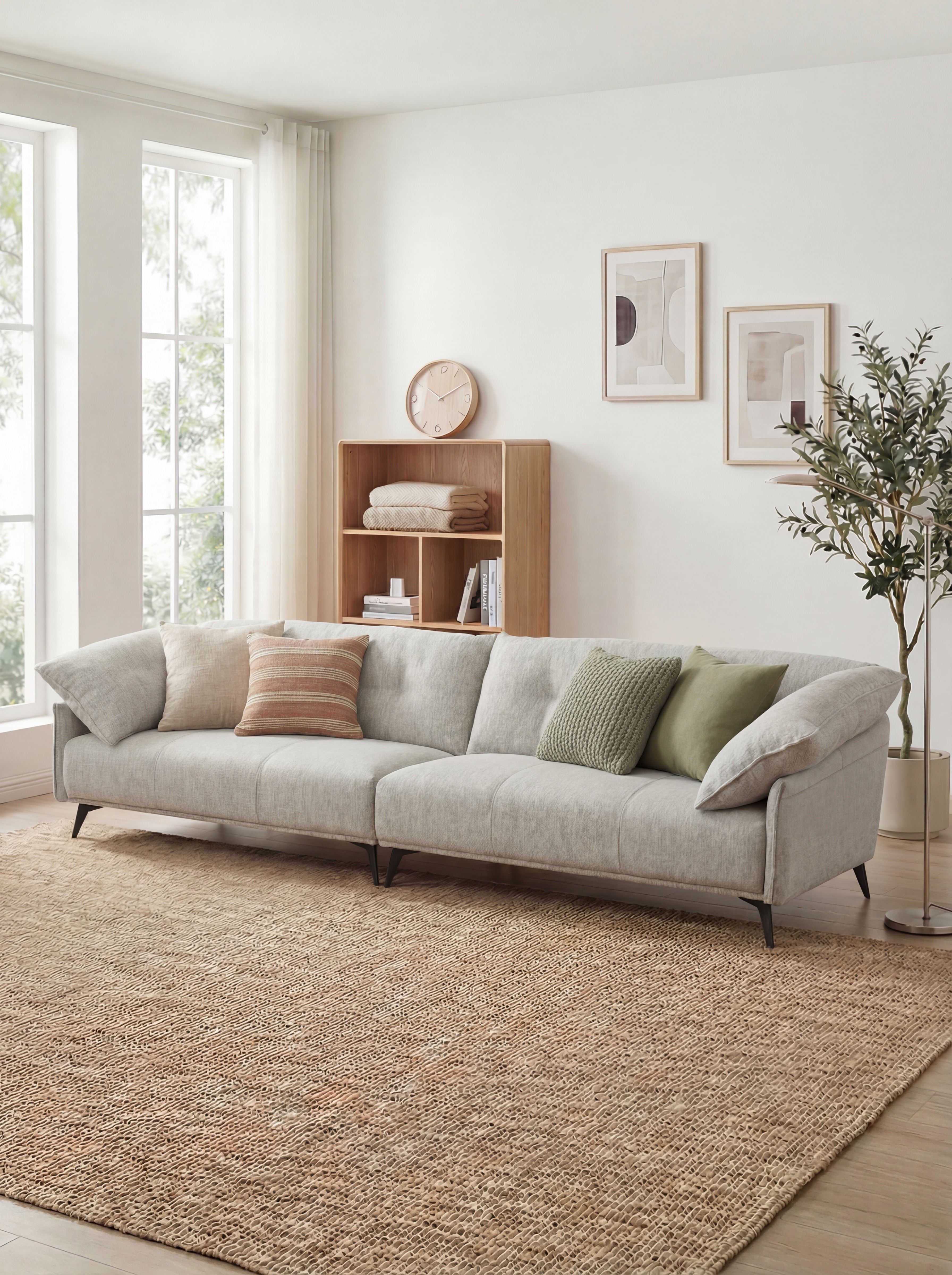 寬體低背與拉鈕美學,讓客廳充滿溫潤質感。