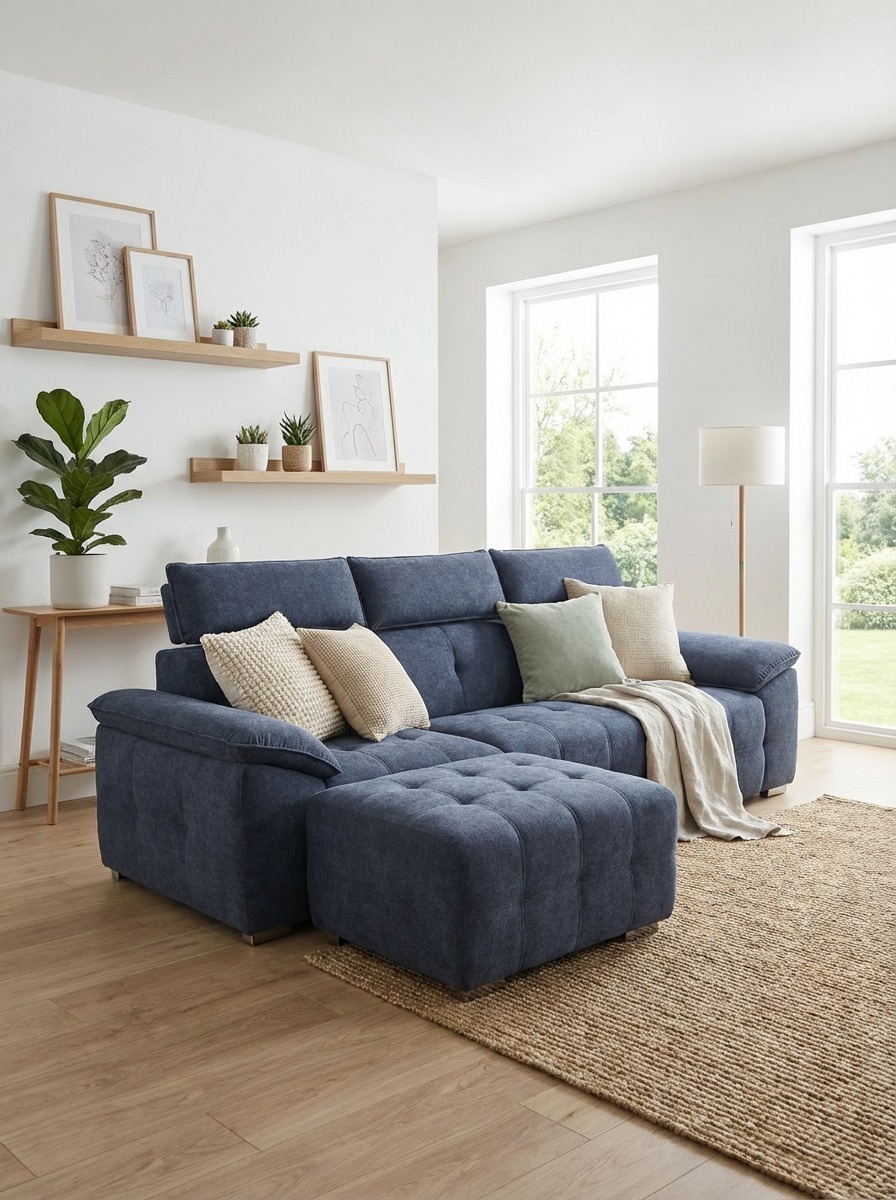深藍格紋與多段頭枕讓放鬆更具內斂層次感。